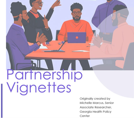 The Partnership Vignettes Workbook contains four “vignettes”, or fictional stories that showcase typical events or occurrences. These were created by Michelle Marcus (Senior Research Associate, Georgia Health Policy Center) based on discussions with community-based organization leaders and community members in Atlanta between 2022-2023.